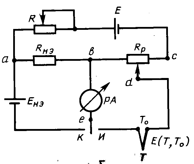 где I = Eнэ/Rнэ – ток в измерительной цепи ас, А; Eнэ – ЭДС нормального (образцового) элемента питания, В; Rнэ – сопротивление нормального элемента питания, Ом; Rbd – часть сопротивления Rр, при котором произошло уравновешивание, Ом.