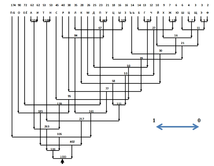 Дерево Хаффмана для букв русского алфавита: