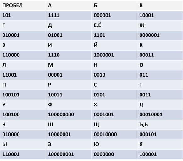 Таблица кодов Хаффмана для букв русского алфавита: