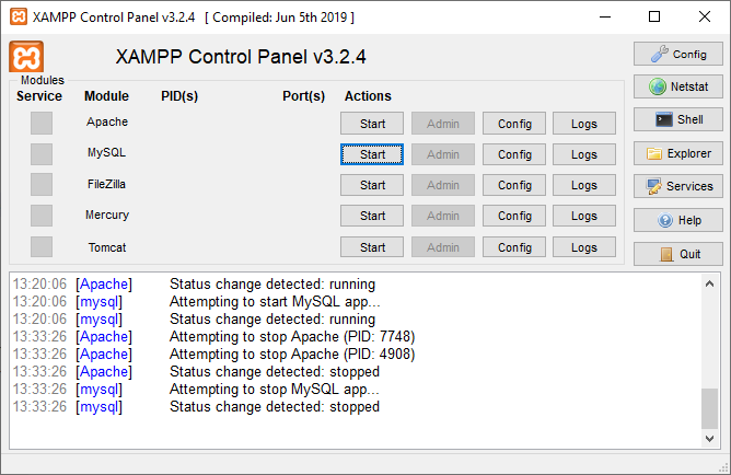 После перезагрузки компьютера запускаем панель управления XAMPP (Пуск->Все программы-> XAMPP->XAMPP Control Panel).