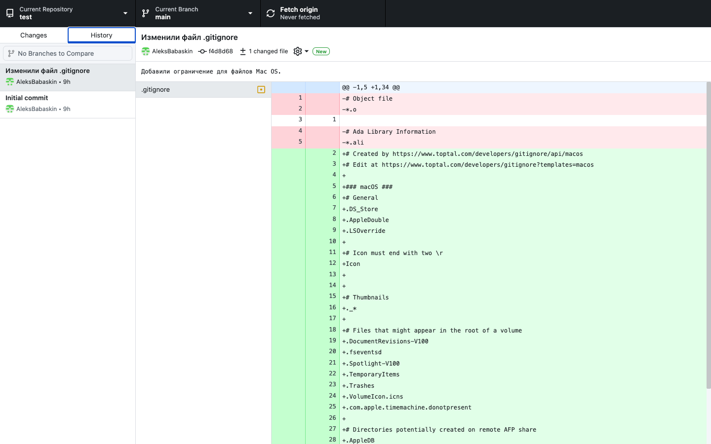 На скриншоте первый коммит технический, он указывает на то, что мы создали репозиторий. Второй коммит – редактирование файл gitignore. История хранит все коммиты, и мы можем вернуться к любому из них. Это страховка от непредвиденных случаев