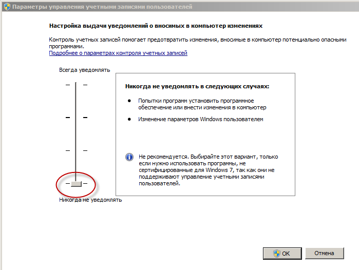 Опускаем ползунок в самое нижнее положение и сохраняем изменения. Всё, UAC отключен.