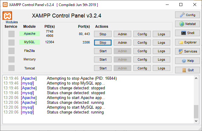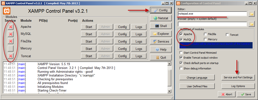 В окне настроек панели управления XAMPP можно включить опции автоматического старта нужных модулей. На рисунке отмечены Apache и MySQL. Теперь при запуске панели управления отмеченные модули будут стартовать автоматически.