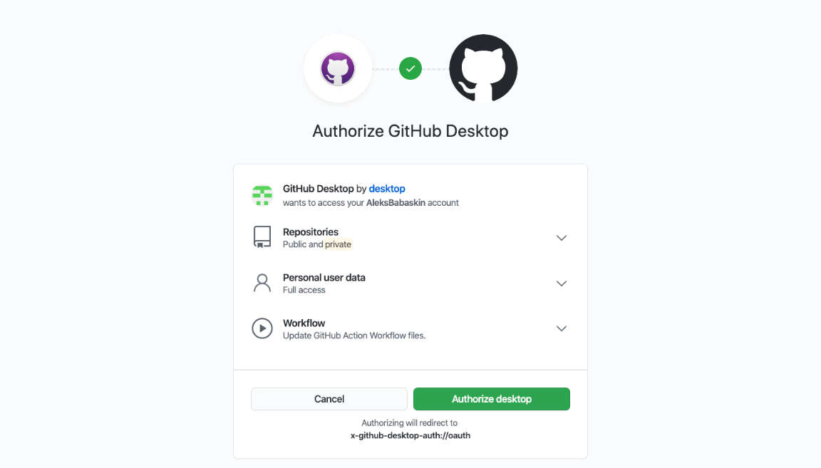 После установки GitHub Desktop запросит синхронизацию с GitHub-аккаунтом. Если аккаунта нет, приложение предложит его создать