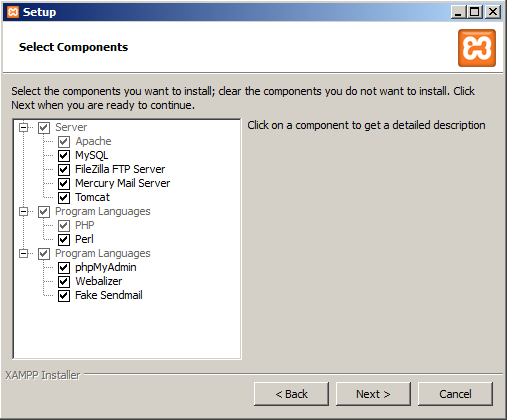 Полный пакет XAMPP для Windows содержит: веб-сервер Apache 2.4.10 с поддержкой SSL, СУБД MySQL 5.6.21, PHP 5.5.19, Perl, FTP-сервер FileZilla 0.9.41, Mercury Mail Transport System 4.63, phpMyAdmin 4.2.11. Даже есть полезные дополнения в виде почтового сервера и phpMyAdmin (для работы с БД MySQL).