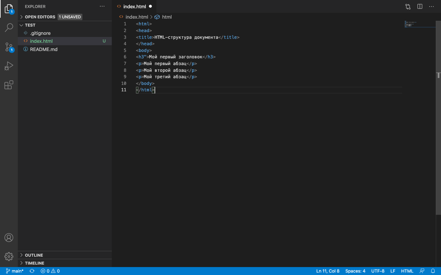 Необходимо создать HTML-файл, добавим базовую структуру и посмотрим на боковое меню — HTML-файл подсвечен зелёным цветом. Это означает, что в проекте появились изменения и они ещё не добавлены в репозиторий на GitHub.