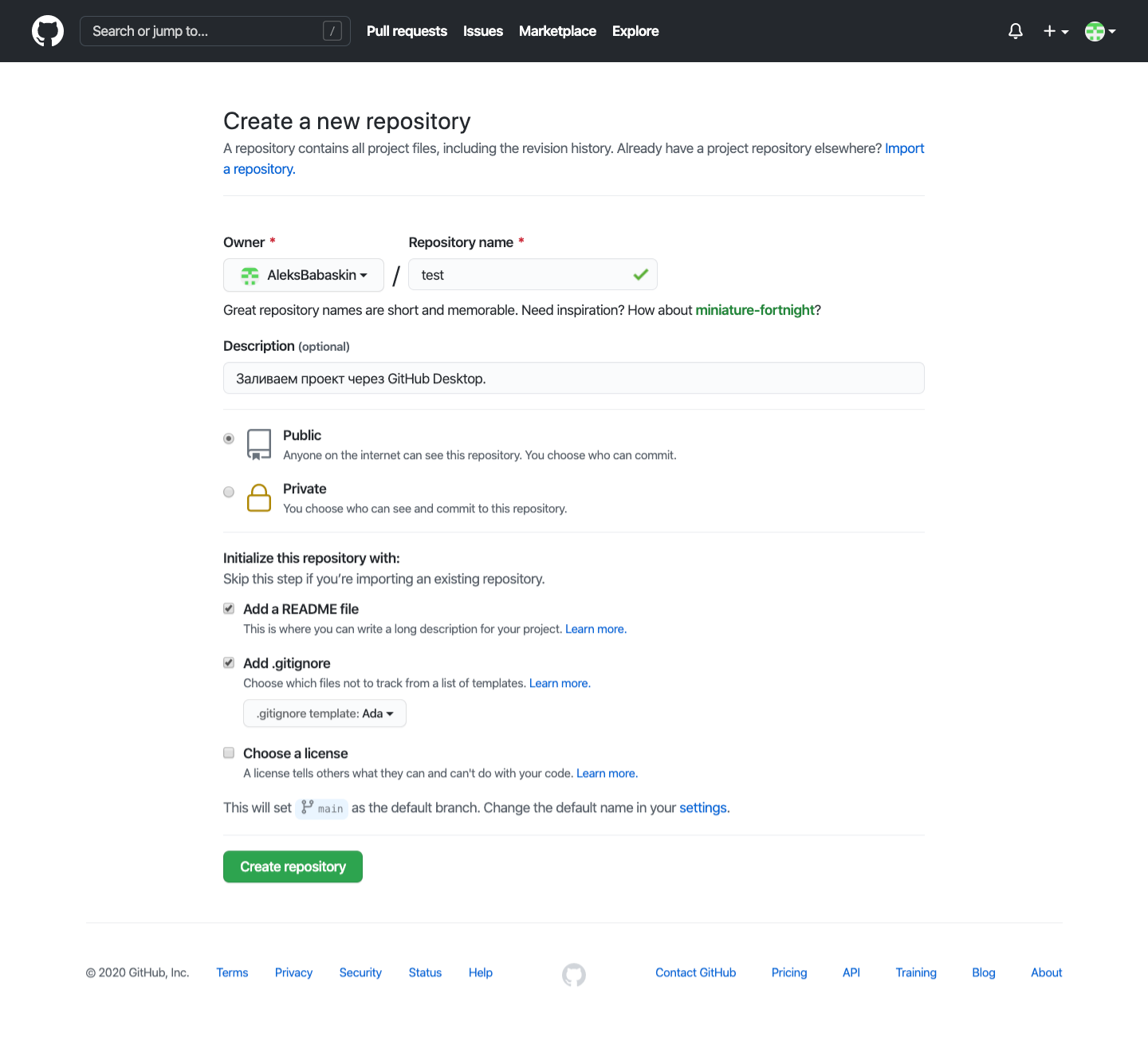 Чтобы создать репозиторий, необходимо нажать на кнопку New repository, назвать проект и кликнуть Create repository. Можно добавить описание проекта, сделать его публичным или приватным и прикрепить технические файлы: