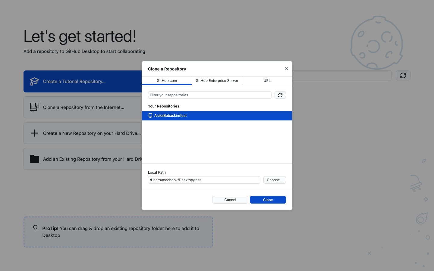 Приложение синхронизируется с удалённым репозиторием и предложит выполнить одно из следующих действий: создать новый репозиторий, добавить локальную папку с компьютера в GitHub Desktop или клонировать существующий репозиторий в папку компьютера.