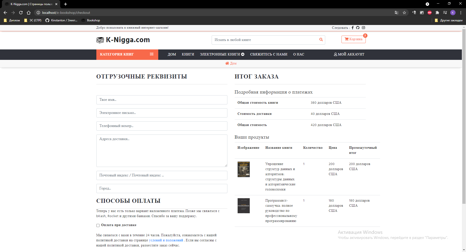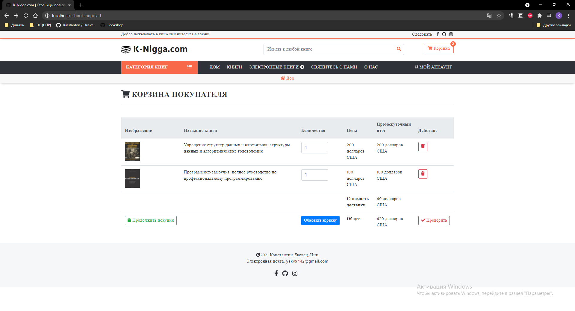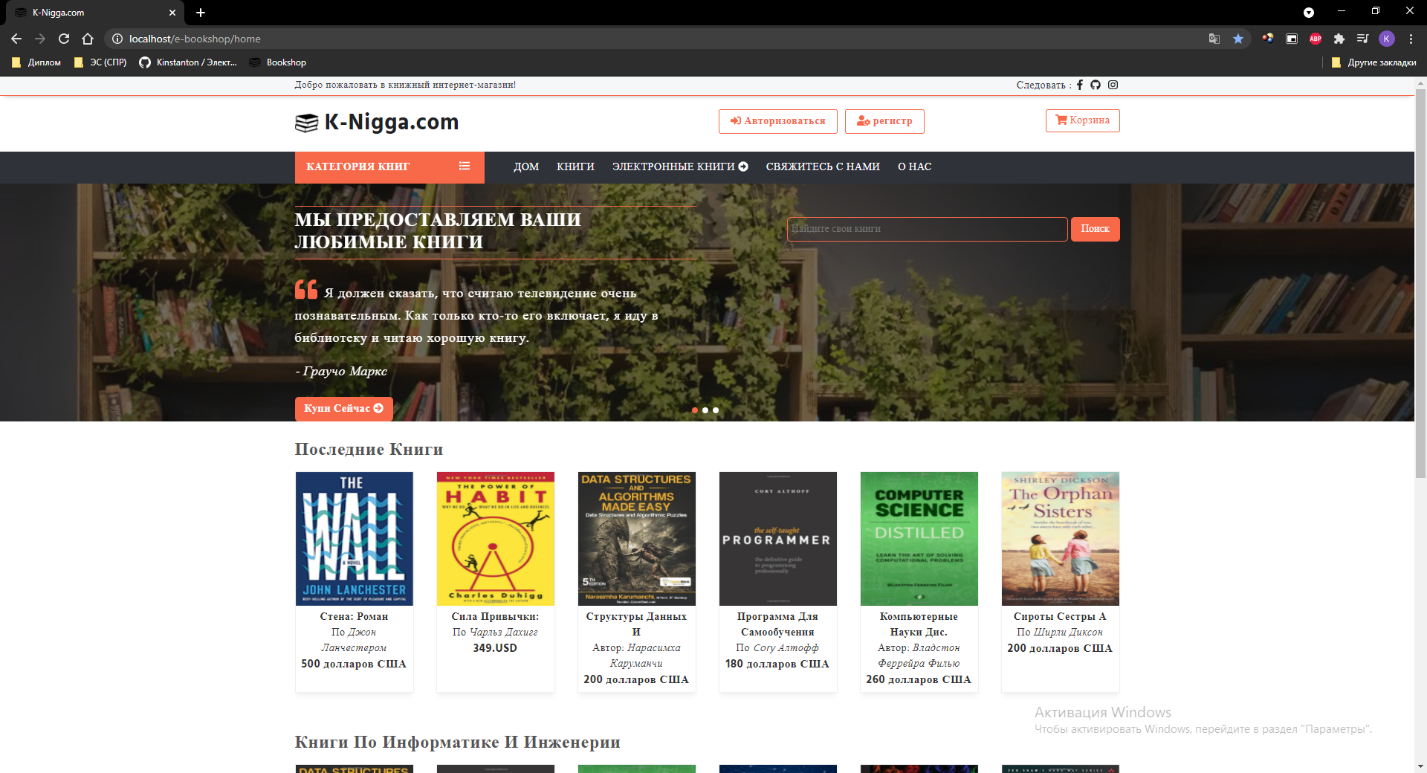 Основной функционал клиента – это просмотр ассортимента продукции книжного магаизна, формирование заказа на основе текущего ассортимента и создание заказа. Просмотр осуществляется на главной странице сайта (рисунок 13). Код верстки главной страницы сайта представлен в приложении А.