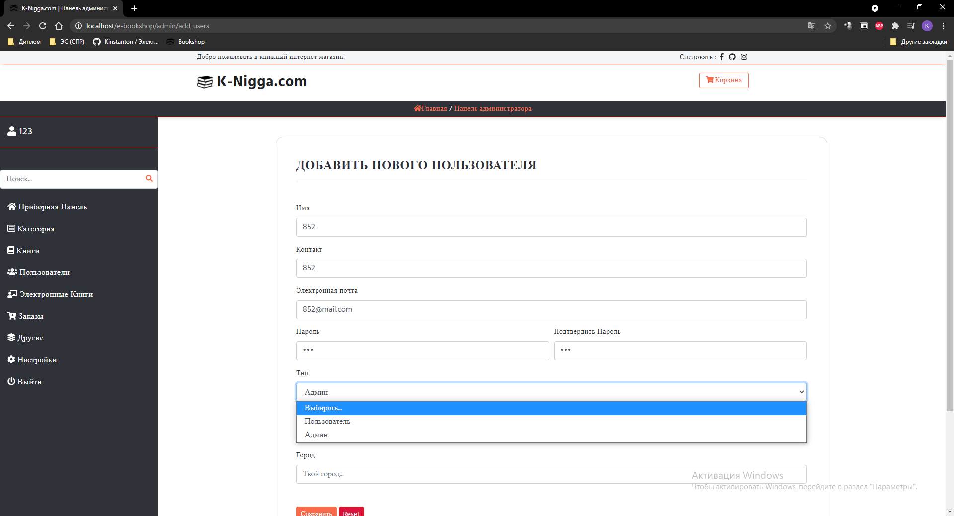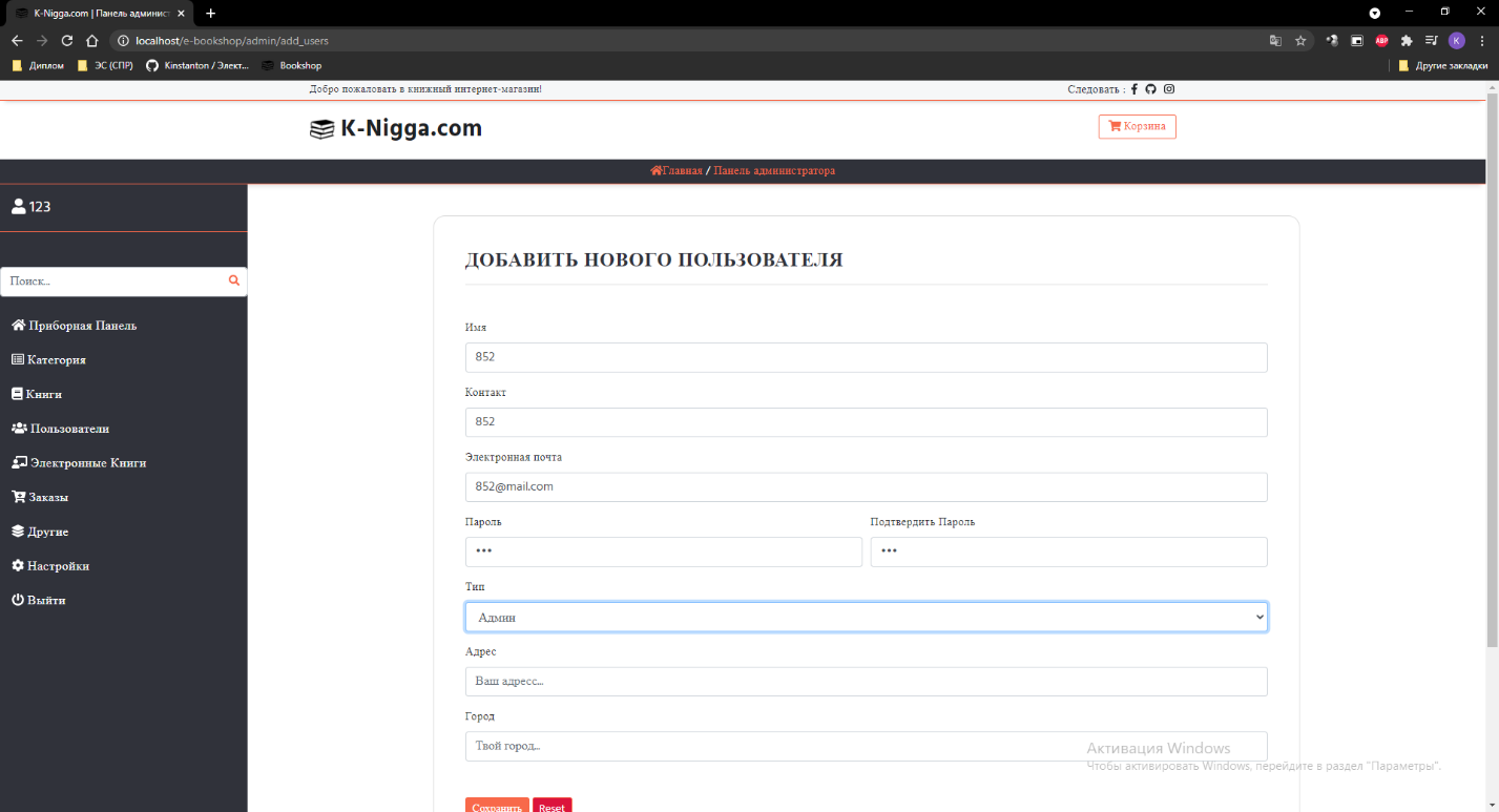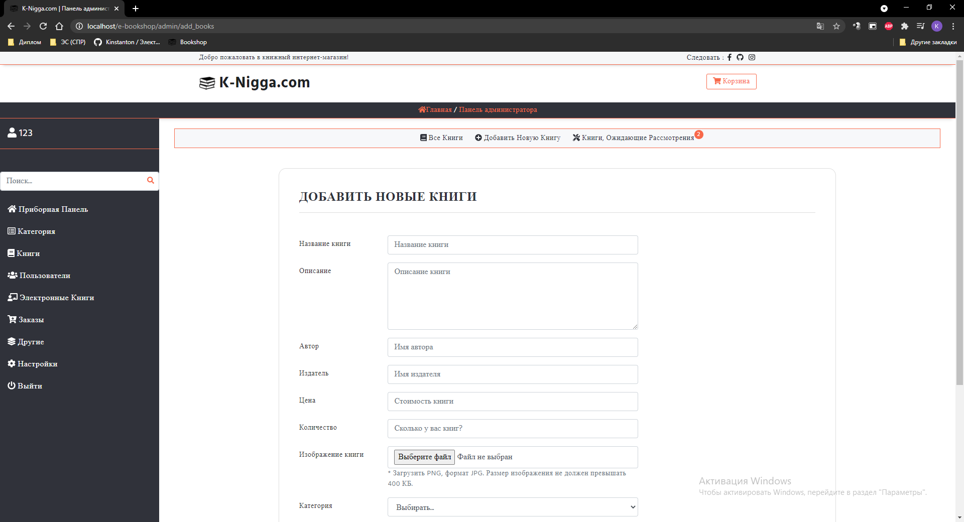 После входа в панель администратора под новым пользователем (рисунок 27), из числа менеджеров можно расширить ассортимент товаров на сайте.
