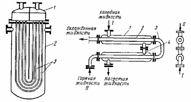 Рис. 1. Схемы теплообменников типа: кожухотрубчатый (слева) и труба в трубе (справа).