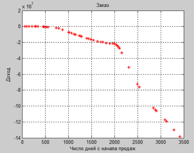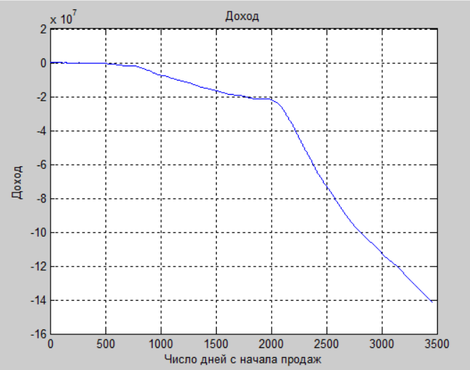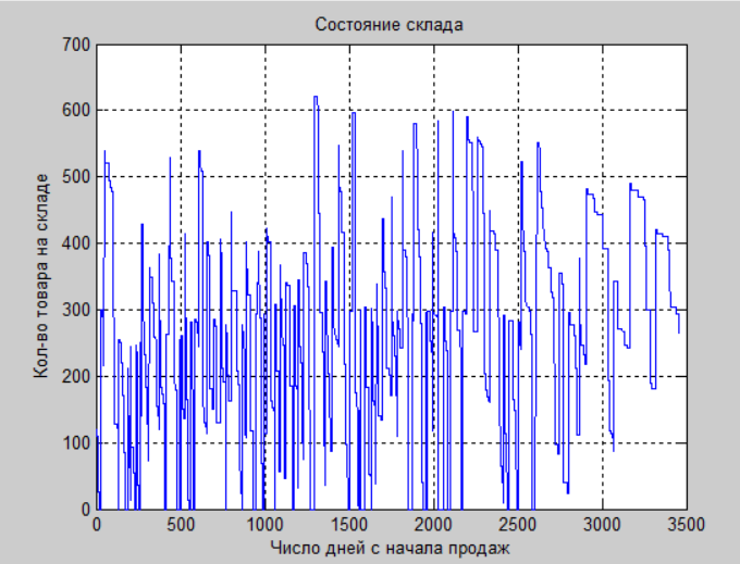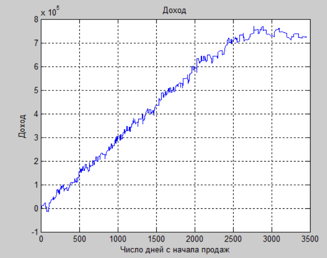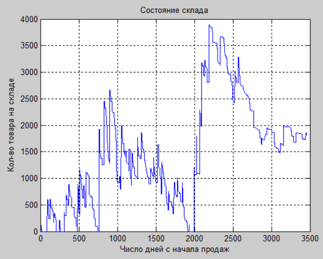 Проанализировав доход предприятия, можно сделать вывод, что при заданной стратегии предприятия происходит потеря дохода, особенно 2000й день, когда произошел большой заказ товара. Получаем убыточное предприятие.