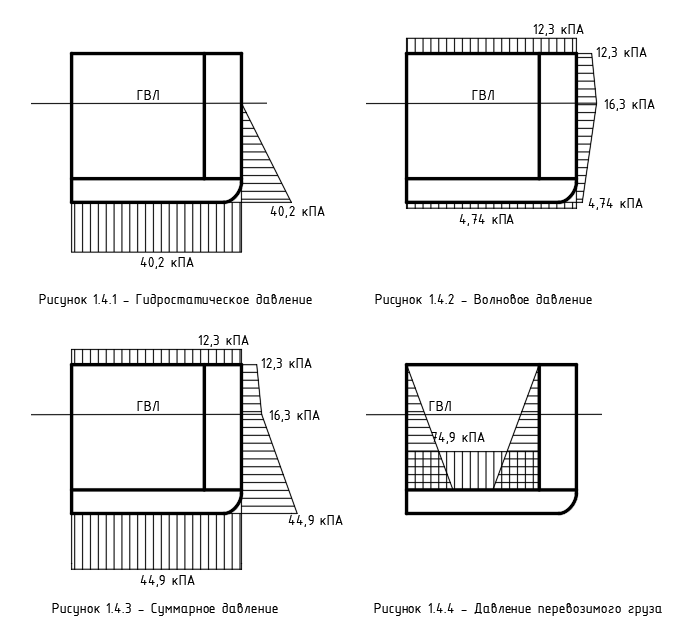 На рисунках 1.4.1 – 1.4.4 показаны эпюры давлений действующие на корпус судна.