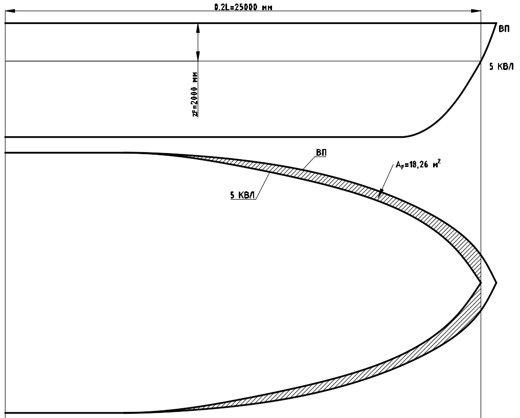 Изгибающий момент при ударе волн в развал бортов определяется для судов длиной от 100м до 200м и при этом должно выполняться условие, что отношении площади AF (площадь между КВЛ и ВП на проекции полу широта в пределах 0,2L) к произведению длины судна на расстояние от плоскости КВЛ к плоскости ВП должно быть более 0,1. Если это отношение больше, то требуется проводить расчет момента при ударе: