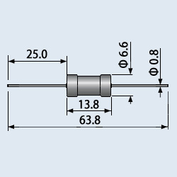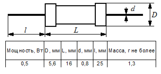 Резисторы типоразмера С1-4 - с углеродистым проводящим слоем. Применяется в цепях импульсного, постоянного и переменного тока. Используется как элемент навесного монтажа. Является неизолированным резистором. Технические параметры резистора типа С1-4 представлены в таблице 2. Изображение с размерами резистора С1-4 представлено на рисунке 6.