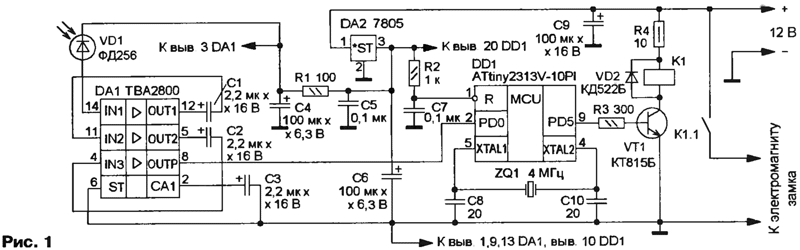 Сразу после подачи питающего напряжения происходят инициализация и запись из ППЗУ в его регистры восьмиразрядных "секретных" слов. Информационные импульсы, поступающие на линию PDO, сравниваются с ними, и при совпадении с первым из слов происходит дальнейшая обработка информации. Если коды всех слов совпадут, на выходе PD5 микроконтроллера на несколько секунд установится высокий уровень, транзистор VT1 откроется, реле сработает и своими контактами К1.1 подаст питающее напряжение на электромагнит (соленоид), который и откроет дверной замок. Затем транзистор VT1 закроется и замок вернется в исходное состояние. Напряжение питания усилителя-формирователя DA1 и микроконтроллера DD1 стабилизировано интегральным стабилизатором DA2.