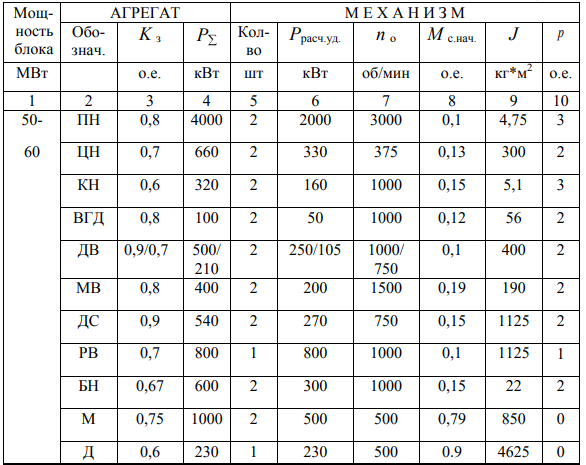 Таблица 2 – Исходные данные по мощности блока