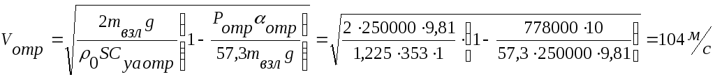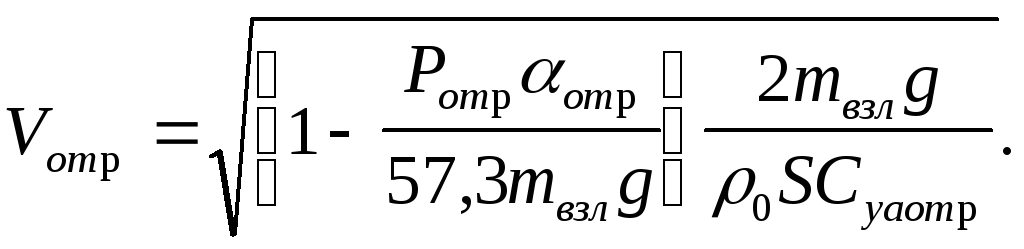 Тяга при отрыве от Земли приближенно равна для ТРДД Pотр=0.9P0взл; P0взл – статическая тяга на взлётном режиме (P0взл=1.2P0). Угол атаки при отрыве αотр (град) выбирается из условия, чтобы при поднятой передней стойке шасси между хвостовой частью самолёта и землёй оставался безопасный зазор 0,2…0,4 м. Принимаем αотр=100. Значение Cyaотр определяется по кривой Cya(α) для взлётной конфигурации самолёта и не должно превышать 0,8Cyamax =0,8*1,3=1,0. Подставляя все значения получим: