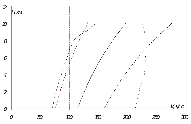 Строится сводный график Vmin , Vmin доп , Vнв , Vmax , Vq в зависимости от высоты полёта. В итоге получается лётный эксплуатационный диапазон высот и скоростей установившегося горизонтального полёта (рис. 2)