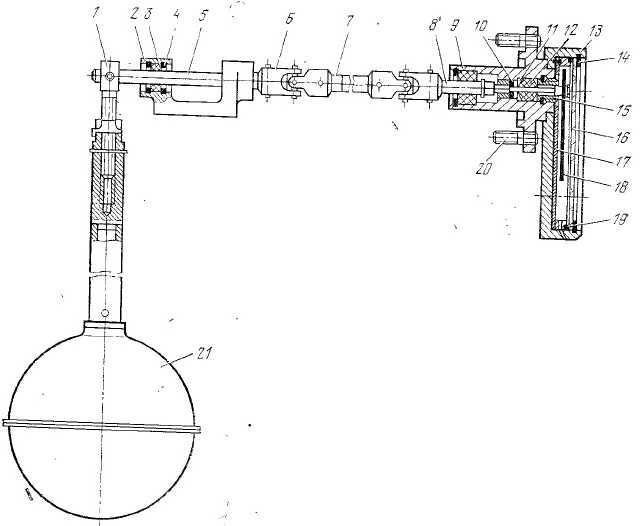 ПУУ (рисунок 4) состоит из шарового поплавка 21с трубкой, при помощи которой он крепится к оси 5 винтом 1. Ось вращается в подшипниках 3, установленных в кронштейне 2.Осевое перемещение подшипников предотвращается разжимными кольцами 4.Вращение оси через две шарнирные муфты 6 и трубу 7 передается валу 8, на котором установлена стрелка 18. Поворачиваясь вокруг своей оси, стрелка указывает количество НП в цистерне на шкале 17. Для обеспечения герметичности вал 8 уплотняют сальником 12, который поджимает втулка 15 через кольца 11.Подбором прокладок 11,3ограничивают осевое перемещение вала 8. Шкала и стрелка закрыты стеклом 16, поджатым к прокладке 19 прижимным кольцом 14. Фланец 9 с корпусом 13 крепят шпильками 20кпатрубку цистерны. Винтом 1 поплавка регулируют расстояние поплавка от оси вращения и, следовательно, угол поворота оси.