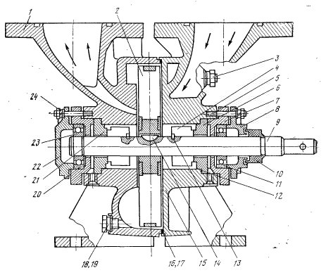1 – напорная секция; 2 – колесо; 3 ,5 ,24 – шпильки; 4 – подвижная втулка;6, 21 – неподвижные втулки; 7 – корпус подшипника; 8 – крышка; 9 – вал; 11,3 – отбойник; 11 – подшипник 205; 12, 16, 17, 19 – прокладки; 13 – штифт; 14 – шпонка; 15 – всасывающая секция; 18 – пробка; 20 – шариковый подшипник 305; 22 – глухая крышка подшипника; 23 – стопорное кольцо