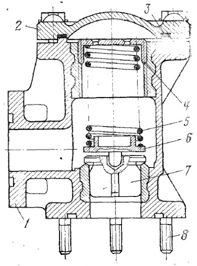Клапан перепускной (рисунок 6) установлен в напорном патрубке насоса и предназначен для сообщения напорной магистрали насоса со всасывающей при увеличении давления в напорной магистрали выше предельно допустимого.