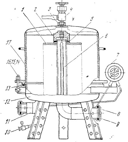 1 – фильтрационный пакет; 2 – нажимная гайка; 3, 5, 9, 13 – прокладки; 4 – игольчатый вентиль; 6– центральная труба; 7 – дифференциальный манометр; 8 – выходной патрубок; 11,3 – пробковый кран; 11 – входной патрубок; 12 – доработанный корпус фильтра; 14 – гайка; 15 – шайба; 16 – откидной болт; 17 – крышка фильтра