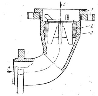 Клапан обратный (рисунок 7) служит для предотвращения вливания нефтепродукта из цистерны через напорный трубопровод после прекращения наполнения цистерны и установлен на выходе трубопроводов из цистерны. Клапан состоит из корпуса 1 и втулки3, на которую опирается клапан2. Под действием напора НП, создаваемого насосом по стрелке А, клапан открывается на величину, ограниченную упорами, и цистерна наполняется.