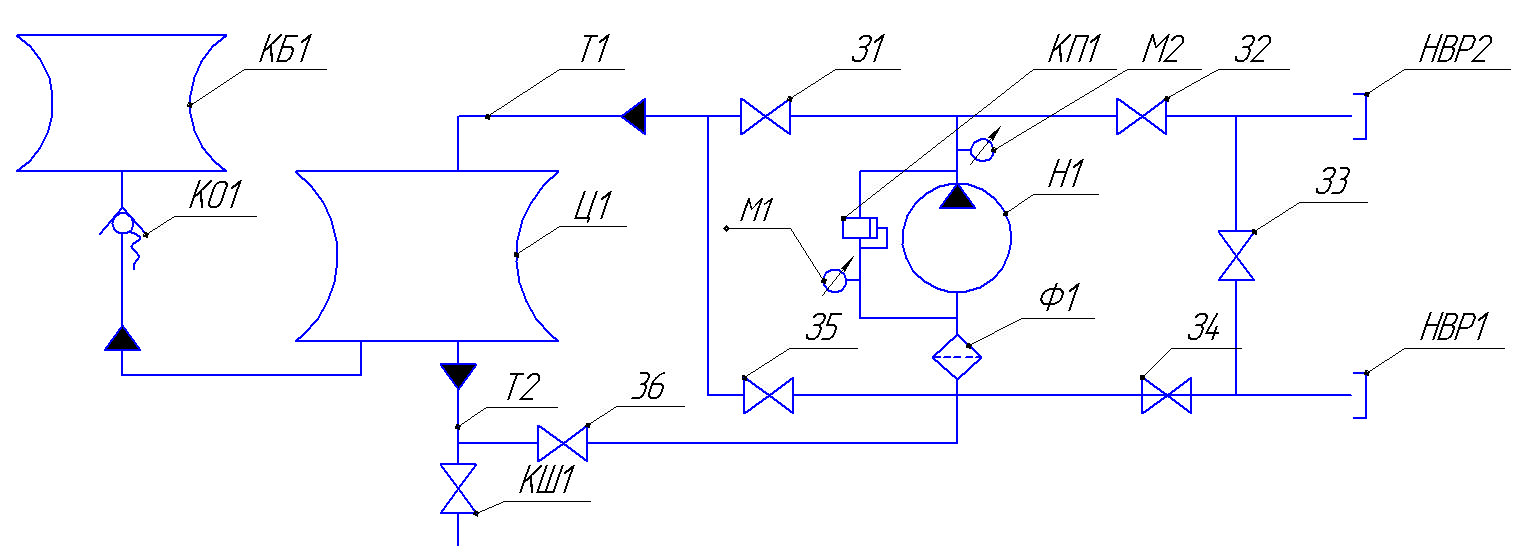 Ц1- цистерна; З1-З6 – задвижки; КШ1 – шаровый кран; НВР1,НВР2 – напорно-всасывающие рукава; Т1 - трубопровод для наполнения; Т2 – трубопровод для опорожнения; Н1 – насос; КБ1 – компенсационный бачек; КО1 – обратный клапан регулируемый; КП – перепускной клапан; Ф1 –фильтр грубой очистки; М1, М2 – манометр