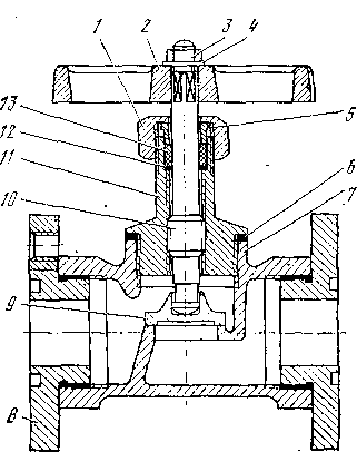 1, 3 – гайки; 2 – маховик; 4 – шайба; 5 – втулка сальника; 6 – прокладка; 7 – корпус; 8 – фланец; 9 – золотник; 11,3 – шпиндель; 11 – крышка; 12 – кольцо; 13 – сальник с гайкой