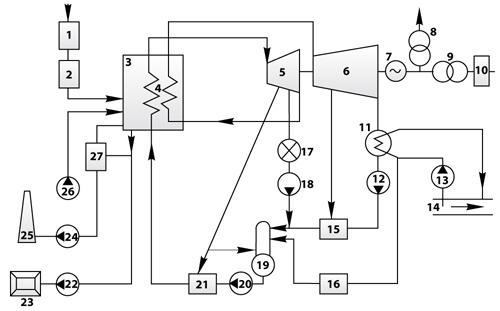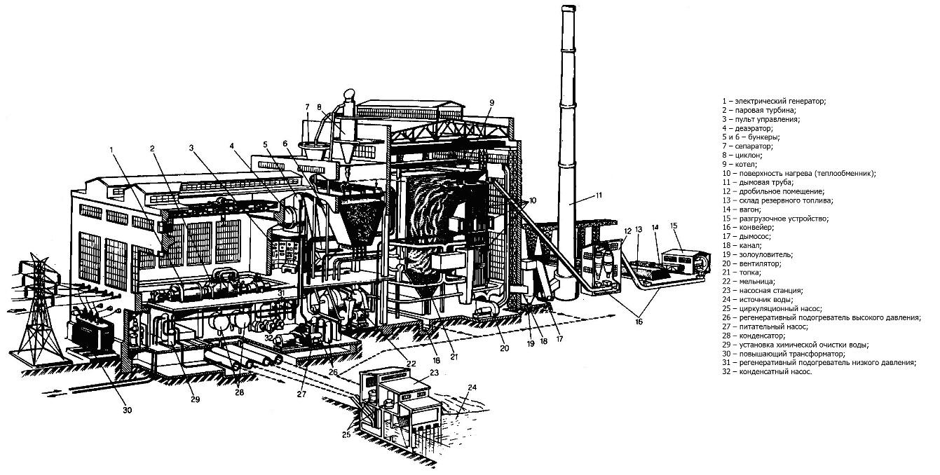 Топливное хозяйство; 2. Подготовка топлива; 3. Котел; 4. Промежуточный пароперегреватель; 5. Часть высокого давления паровой турбины (ЧВД или ЦВД); 6. Часть низкого давления паровой турбины (ЧНД или ЦНД); 7. Электрический генератор; 8. Трансформатор собственных нужд; 9. Трансформатор связи; 10. Главное распределительное устройство; 11. Конденсатор; 12. Конденсатный насос; 13. Циркуляционный насос; 14. Источник водоснабжения (например, река); 15. Подогреватель низкого давления (ПНД); 16. Водоподготовительная установка (ВПУ); 17. Потребитель тепловой энергии; 18. Насос обратного конденсата; 19. Деаэратор; 20. Питательный насос; 21. Подогреватель высокого давления (ПВД); 22. Шлакозолоудаление; 23. Золоотвал; 24. Дымосос (ДС); 25. Дымовая труба; 27. Дутьевой вентилятор (ДВ); 28. Золоуловитель.