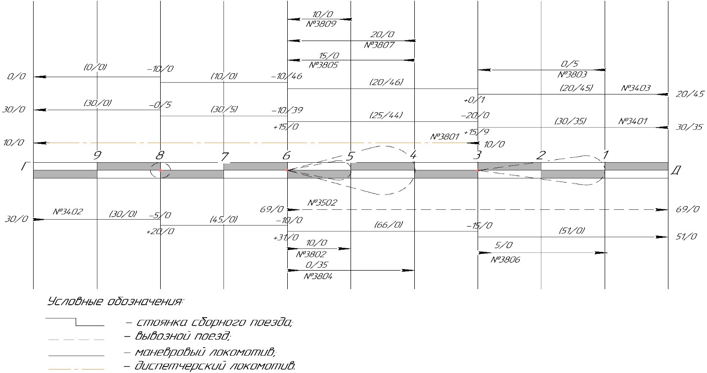 На основании диаграммы местных вагонопотоков на участке Г-Д в обращение назначим вывозной поезд в четном направлении: