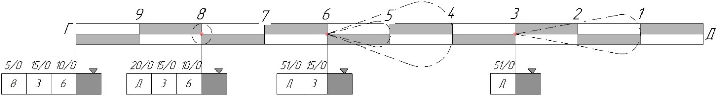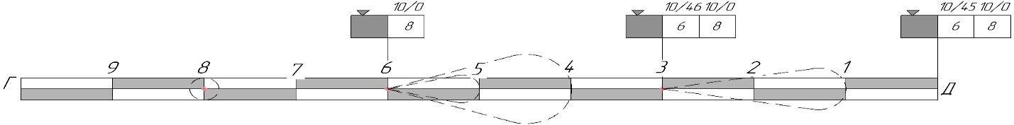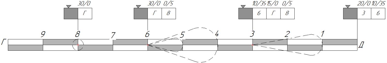 На станции 3 поездным локомотивом в голове состава производится отцепка 20 вагонов и прицепка в хвост состава 15 груженых вагонов назначением на станцию Г, 5 порожних вагонов на станцию 8 и 4 порожних вагонов на станцию 6.