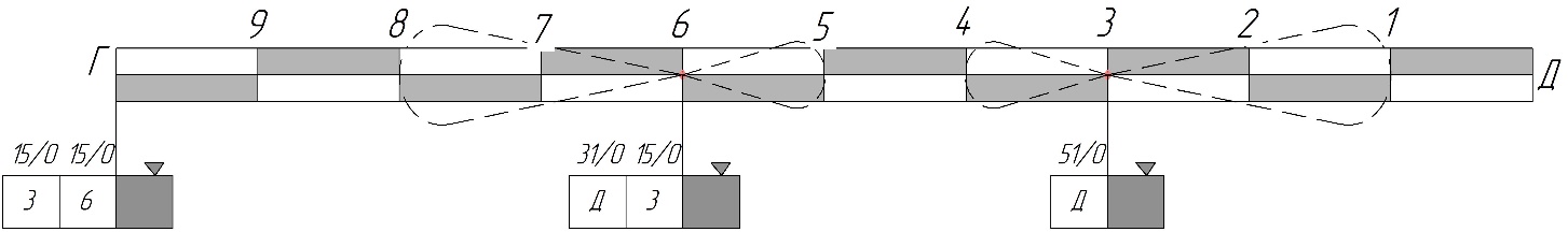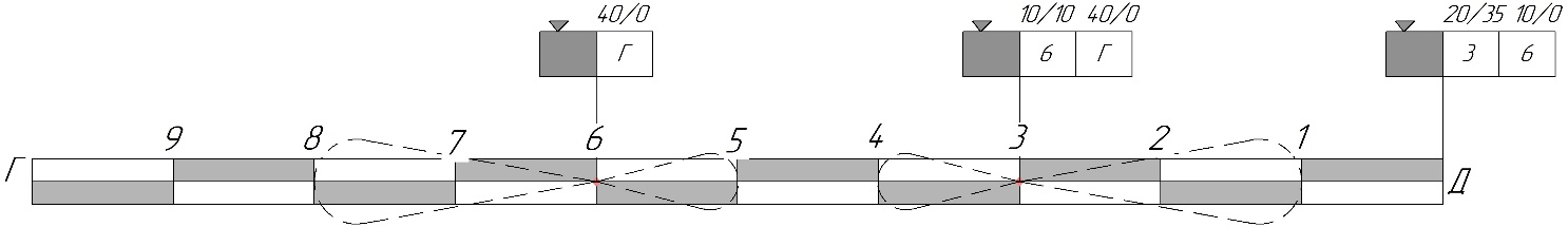 На станции 3 поездным локомотивом в голове состава производится отцепка 20 груженых и 35 порожних вагонов и прицепка в хвост состава 10 порожних вагонов назначением на станцию 6 и 40 груженых вагонов назначением на станцию Г.