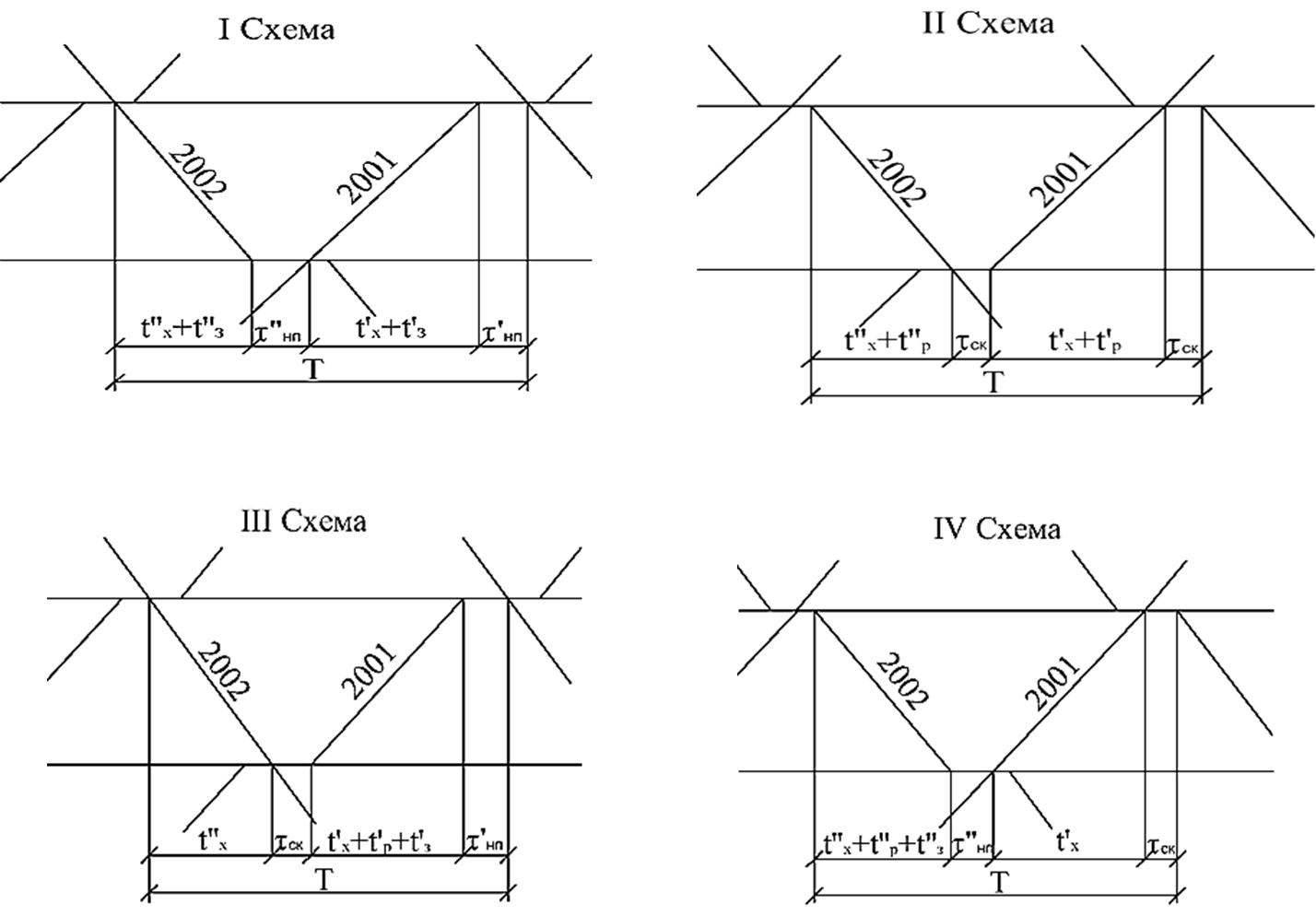 Периоды графика перегона при заданном времени хода пары поездов могут принимать различные значения в зависимости от порядка пропуска поездов через раздельные пункты, ограничивающие перегон. Возможные 4 варианта пропуска поездов приведены на рисунке 3.8.