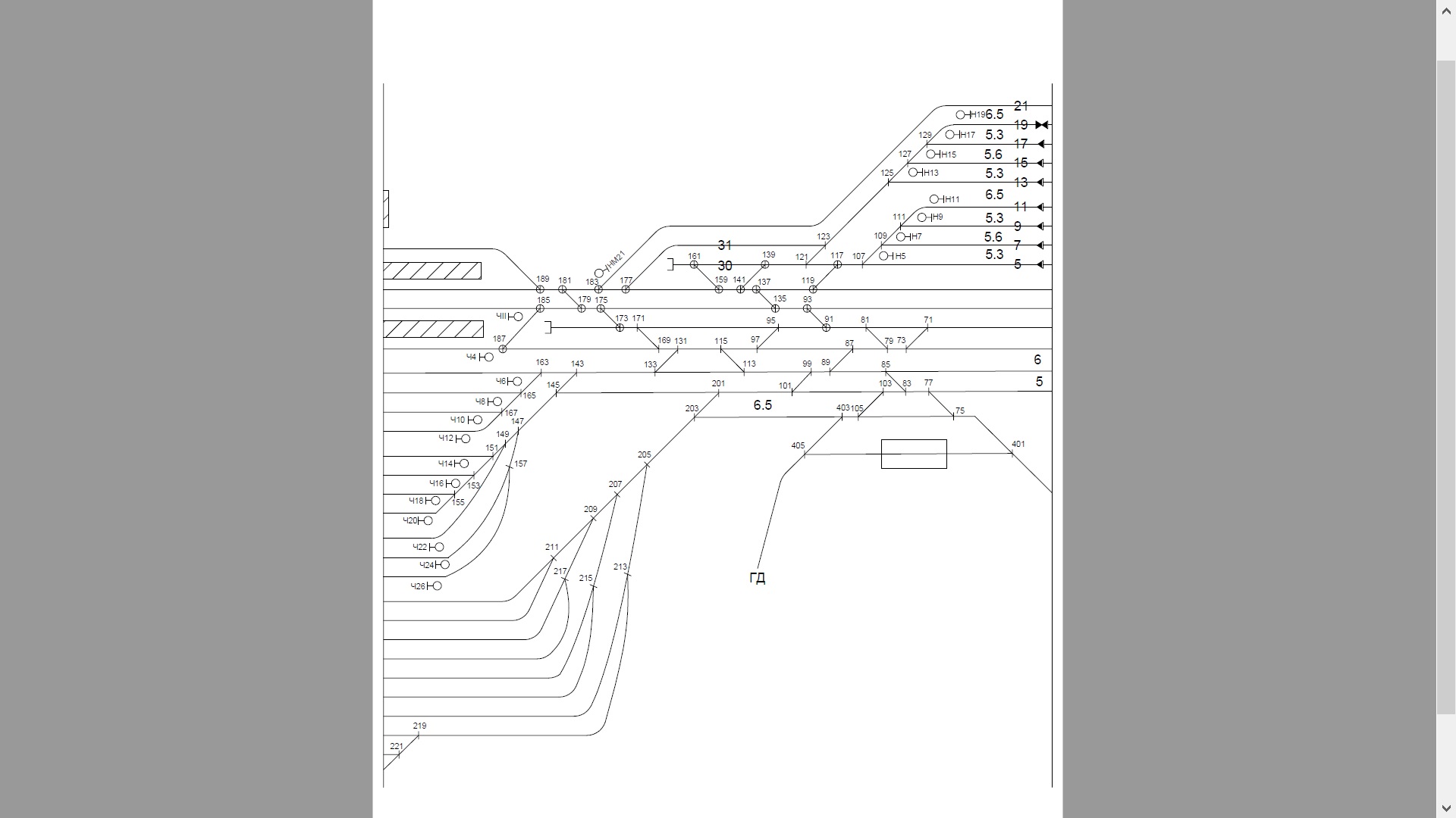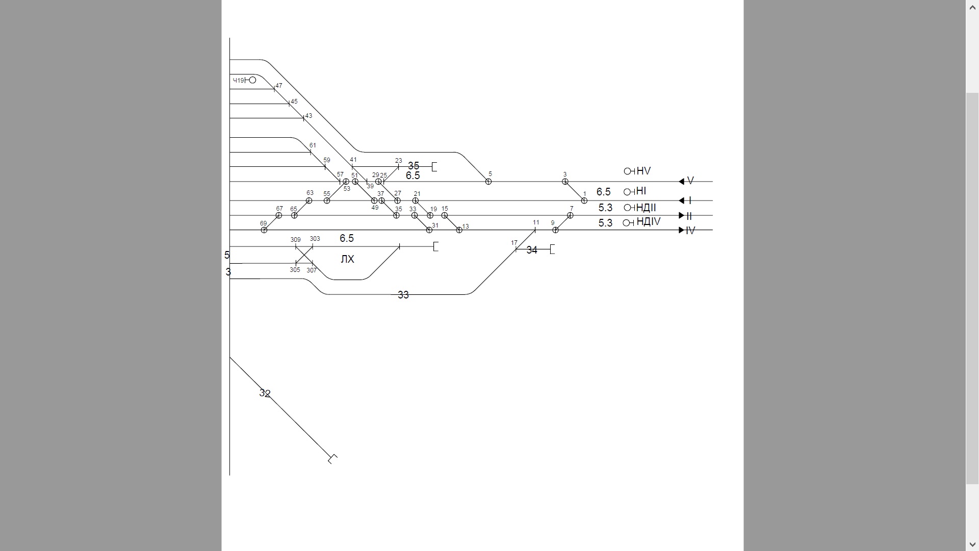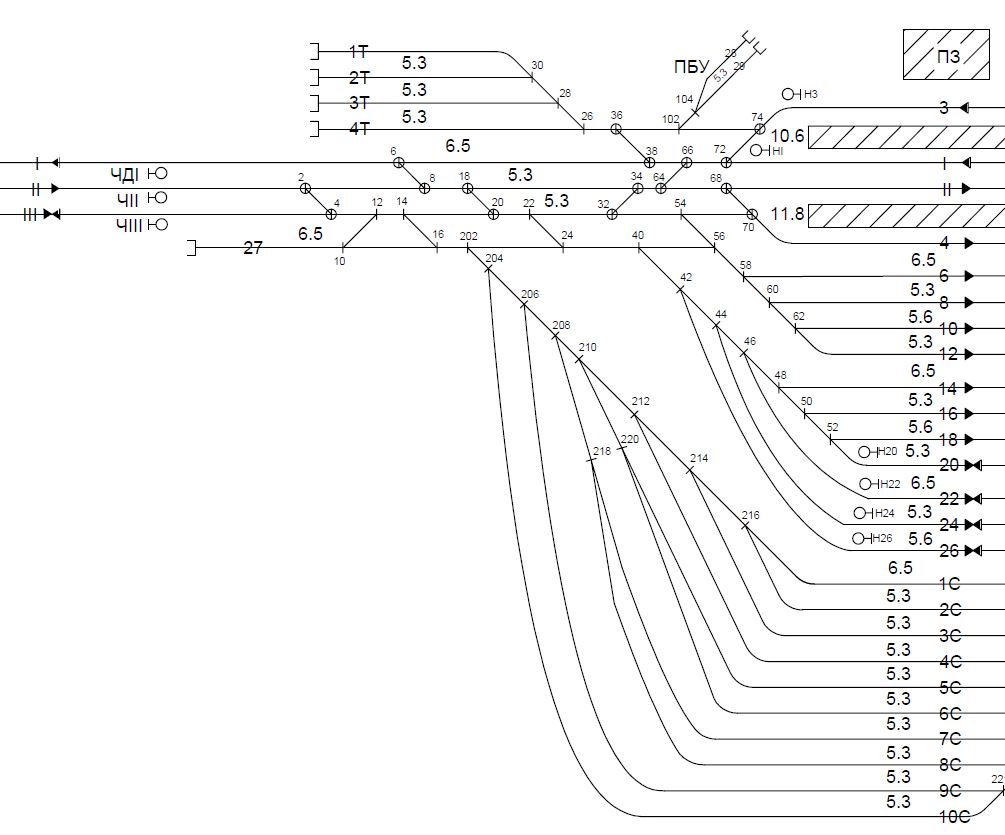 Рисунок 3.3 – Конструктивная схема нечетной горловины участковой станции полупродольного типа