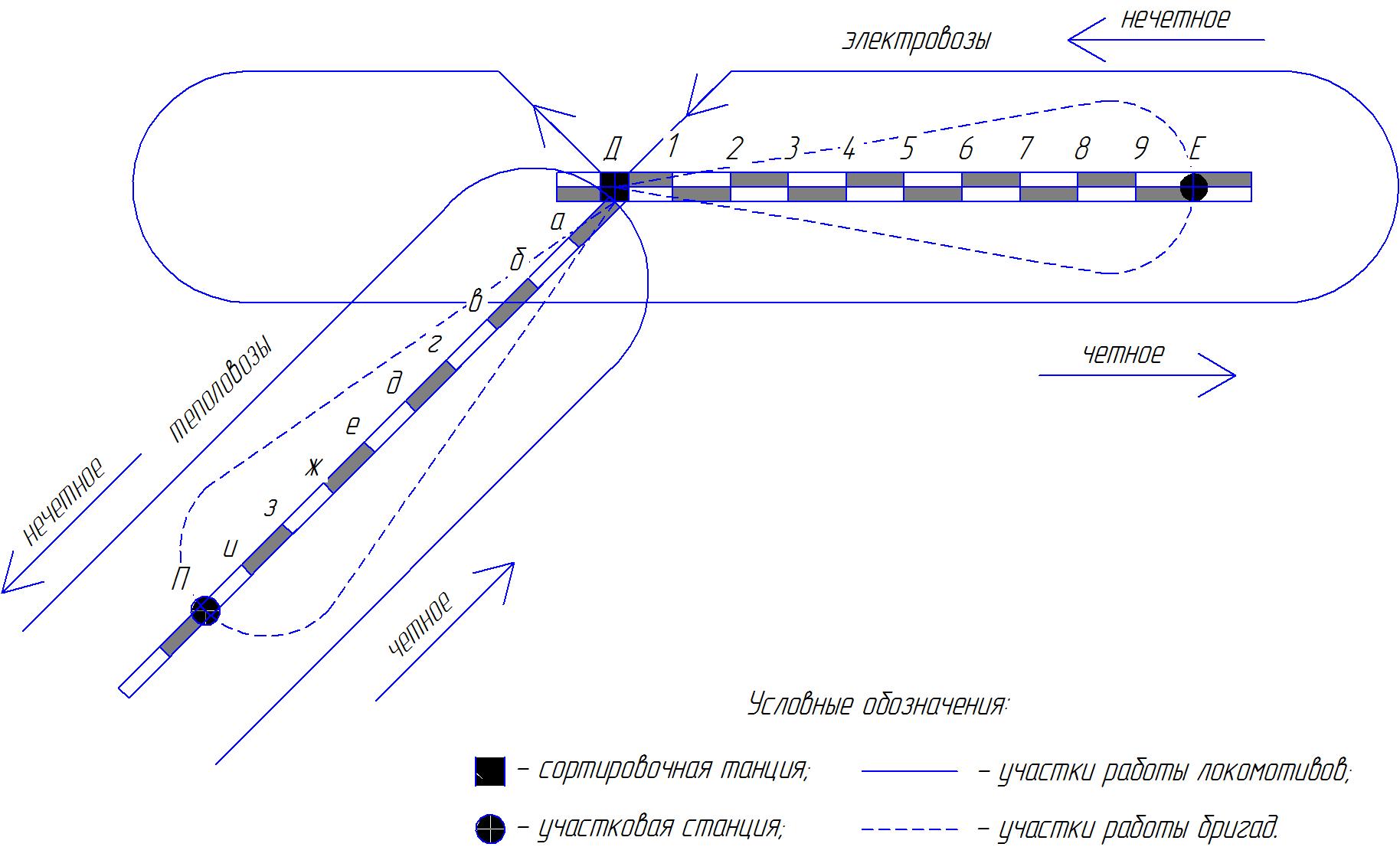 На дороге имеется 10 технических станций. Из них 9 - участковые. Станция Д является сортировочной. На каждом перегоне между техническими станциями располагается по 9 промежуточных станций. Каждая техническая станция является пунктом смены локомотивной бригады. Локомотивы обращается по кольцевому способу от Б до Л, заходя в основное депо Д для ТО.