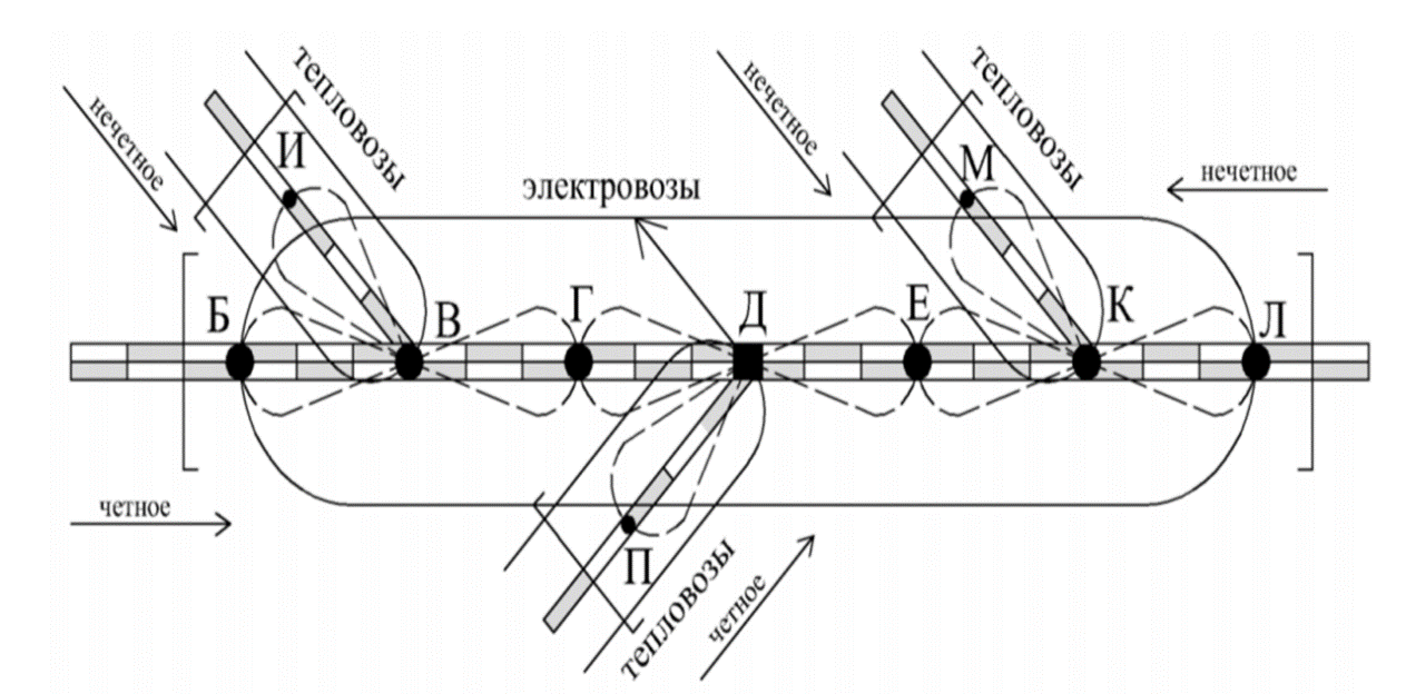 Типовая схема узловой сортировочной станции приведена на рисунке 1.3.
