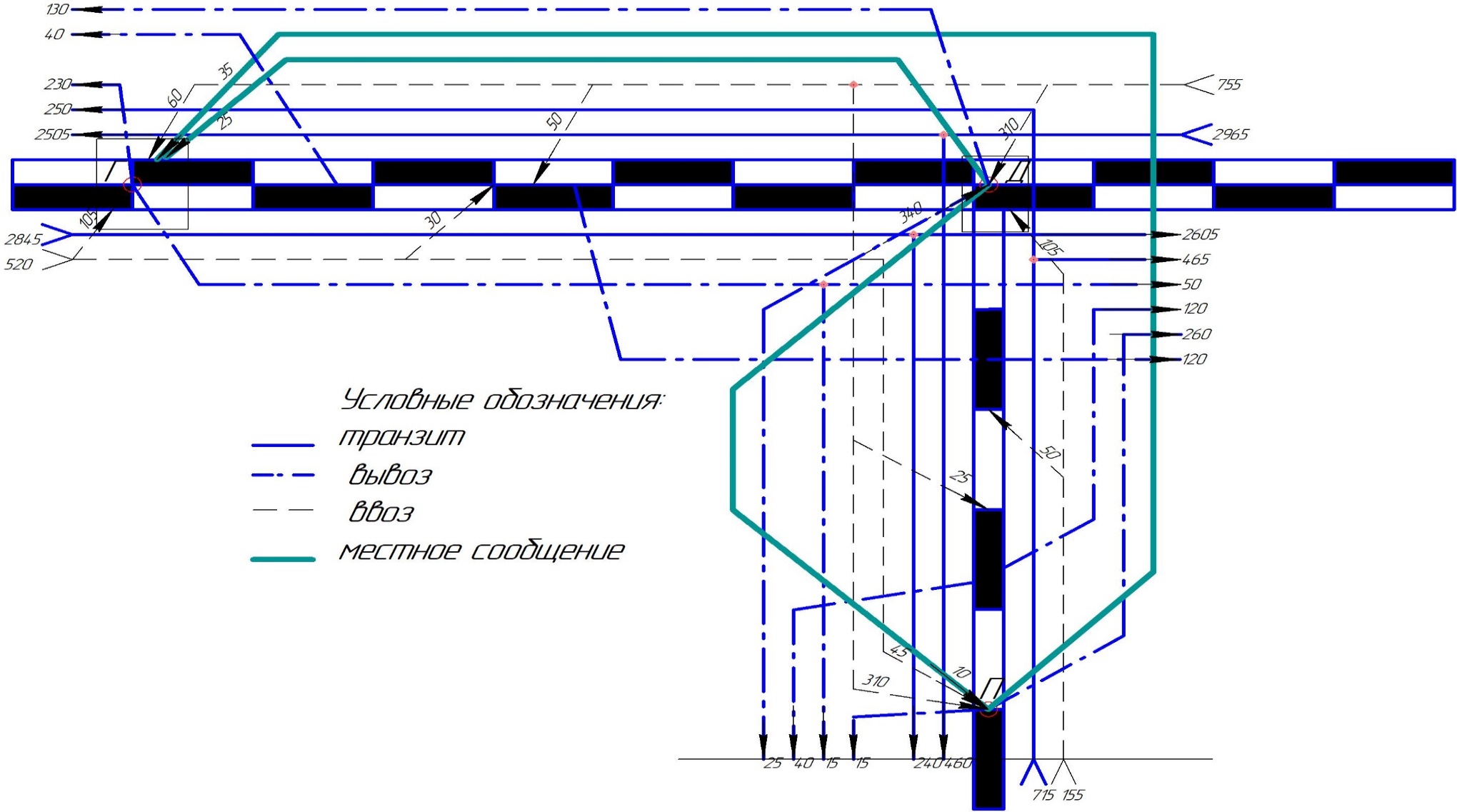 Диаграмма местных вагонопотоков, разрабатывается для определения числа и категории поездов для работы с местными вагонами на участке.
