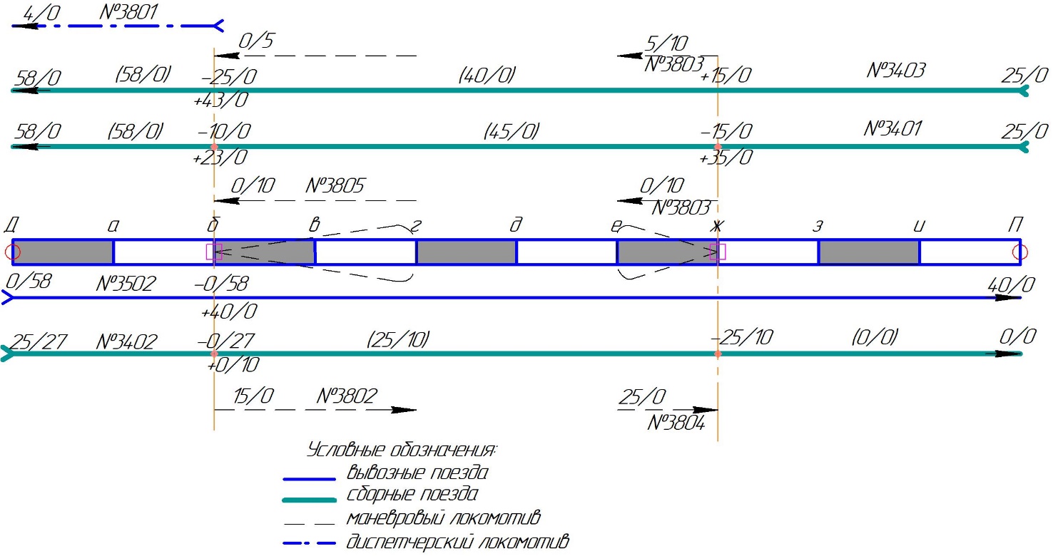 На участке Д - П для выполнения грузовых операций открыты следующие станции: б, г, е, ж. Остальные станции – а, в, д, з, и – являются обгонными пунктами. Для разработки первого варианта суточного плана-графика местной работы определены следующие станции дислокации маневровых локомотивов:
