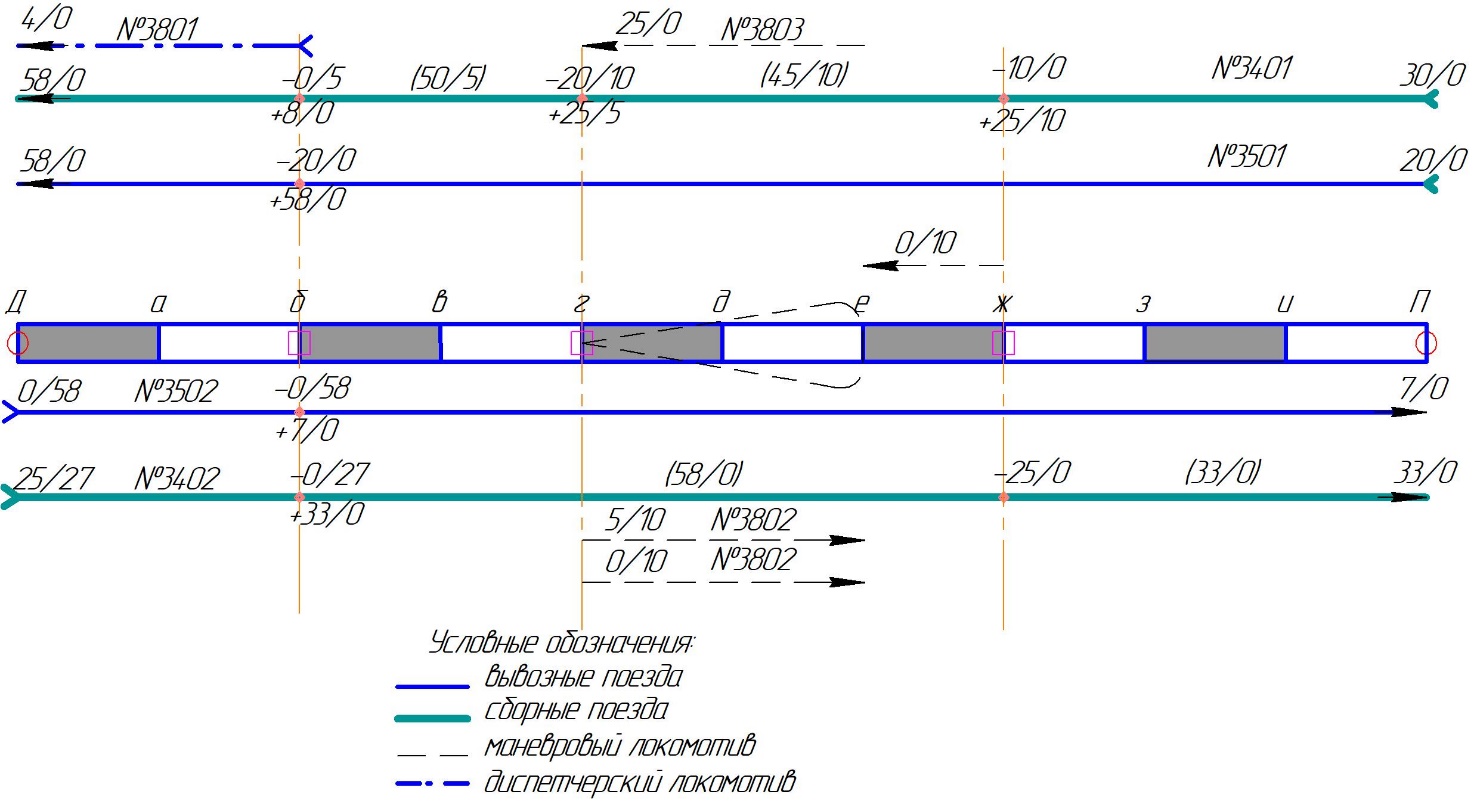 Схема обслуживания участка Д – П местными поездами по второму варианту приведена на рисунке 2.4.