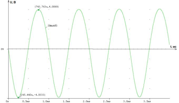 По осциллограмме рисунка 4.3.6 определяем значения амплитуд выходного сигнала: U+ = 4,009 В - амплитуда положительной полуволны;