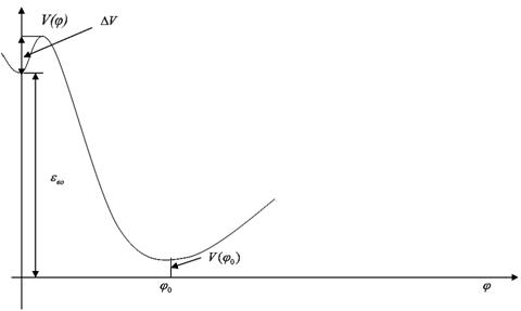 Волновая функция Ψ(a‚φ) представляется как характеризующая поле Вселенной. Главной трудностью толкования уравнения (1.2) как описывающего эволюцию Вселенной, является независимость Ψ(a,φ) от времени. Существует множество попыток введения этой зависимости [5]. С нашей точки зрения, уравнение Уилера – Девитта указывает на необходимость постулирования состояния неопределённого во времени как предшествующего направленной эволюции. В свете всего вышеизложенного следует предположить, что уравнение Уилера – Девитта описывает ненаблюдаемое состояние предшествующее эволюции Вселенной, как хаотическое. Под хаосом мы подразумеваем как недетерминированность метрики, так и симметричное состояние калибровочных полей. Хаос характеризуется энтропией как мерой неопределенности состояния. Можно предположить, что плотность энергии вакуума пропорциональна энтропии в указанном смысле. В самом деле, смещение нулевого уровня энергии подразумевает неопределённость состояния. Вообще говоря, при отсутствии направленности времени состояние более правильно характеризовать именно плотностью энтропии. В общепринятой теории потенциал V(φ) предполагается имеющим представленный ниже вид и эволюция Вселенной из начального состояния объясняется стремлением вакуума перейти в состояние с минимумом энергии.