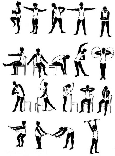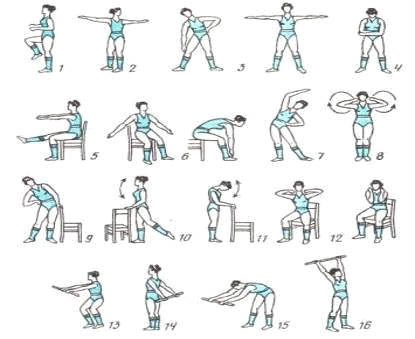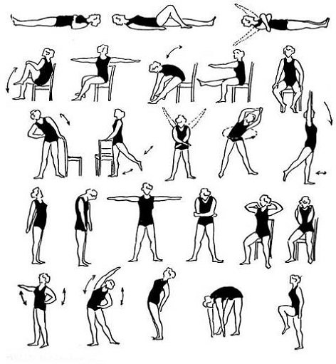 Більшість фізичних вправ виконуються з вихідного положення сидячи на кріслі. Вправи виконують у повільному темпі, повторюючи 2-4 рази. Між вправами користуються паузами відпочинку протягом 20-30 с.
