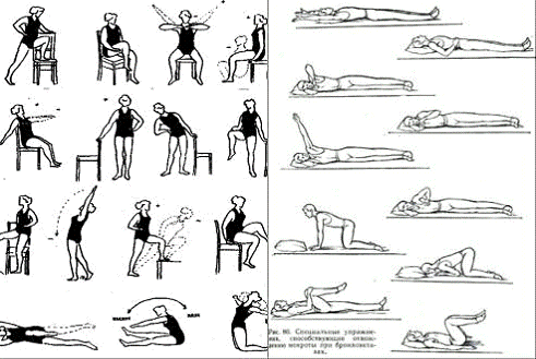 Хворі ослаблені тривалим патологічним процесом. У них інтоксикація. Для покращення відтоку гнійної мокроти з легень широко використовують дренажні положення та фізичні вправи. Їх підбирають в залежності від місцезнаходження великих бронхоектазів. Коли бронхоектази знаходяться у верхніх відділах легень, то дренажні положення та фізичні вправи виконують з вихідного положення сидячи на кріслі. Відтік з бронхоекстазів нижніх відділів легень збільшується з коліно-ліктьового положення і лежачи на животі на кушетці з підвищеним ножним кінцем (на 20-30 см). З вихідного положення сидячи на кріслі мокрота з нижньої долі правої легені добре відходить при повільному нахилі тулуба вперед: на видосі хворий, покашлюючи, дістає руками носок лівої ноги. Такий самий ефект буде при виконанні цієї вправи з вихідного положення стоячи.