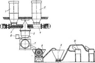плоскочашечний підйомник; 6 - лоток; 7 - дозрівач; 8- шнековий живильник; 9-