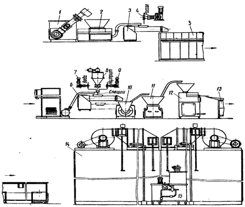 Рис. 2 Поточно-поточно-механізована лінія для виробництва сосисок конструкції ВНДЕКІ продмаша: 1 - Вовчок; 3 - насос-дозатор фаршу; З - змішувач: 4 - насос-дозатор розсолу; б- горизонтальний шнековий дозрівач; 6 - змішувач; 7 - насос-дозатор води; 8 - дозатор сипучих компонентів фаршу; 9- насос-дозатор розчину нитриту; 10 - подрібнювач; 11 - насос- живильник; 12-шприц-дозатор; 13 - конвеєрний стіл; 14 - термоагрегат; 15 - димогенератор.
