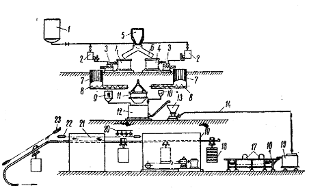 повітряного охолодження; 22 - горизонтальний конвеєр; 23 - похилий конвеєр.
