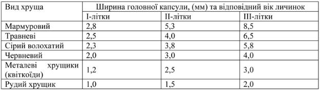 Для обчислення підсумкової загрози слід враховувати коефіцієнти шкідливості окремих видів і віків їх личинок. Шкідливість травневих і волохатого хрущів прирівнюється до 1, мармуровий — в 2 рази шкідливіший за попередні, червневий — 1/3 та інші хрущі — 1/4 шкідливості травневих. Одночасно личинки-однолітки — 1/2, двохлітки — 2/3 трьохліток травневих прийнятих за 1,0. Всі обрахунки ведуться на трьохлітку травневих хрущів. Нижче наведені приклади обрахунків загрози культурам та розсадникам від личинок хрущів за даними осінніх обстежень ґрунту.