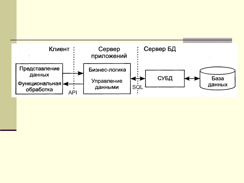 Серверы приложений организуют окружение для работы служб, вызываемых клиентами. Клиент не взаимодействует напрямую с сервером БД. Вызовы служб похожи на архи-